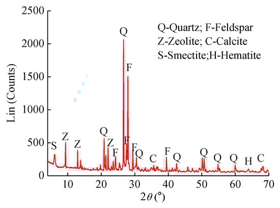 To investigate the post-peak mechanical behavior of fractured rock, red sandstone from Linyi in Shandong Province, China, was chosen as the experimental material for this research [8,23]. The red sandstone we used is a fine-grained homogeneous material with a bulk density of 2435 kg/m3. According to X-ray diffraction (Figure 1), the minerals in the red sandstone specimens are mainly quartz and feldspar, with some zeolite, calcite and smectite, and very minor quantities of hematite [24]. All of the test specimens were cylindrical, i.e., 50 mm in diameter and 100 mm in length. The specimens were soaked in distilled water for more than 72 h to ensure that they were fully saturated, which can reduce the post-peak brittleness of sandstone and guarantee post-peak unloading effects [25,26].