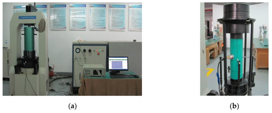 All of the triaxial compression and creep tests on the sandstone specimens were carried out on a TAW-2000 servo-controlled rock mechanics system with a maximum loading capacity of 2000 kN and confining pressure of 60 MPa [27,28]. During the tests, the axial and radial deformations were measured with axial and radial extensometers with a range of 10 mm and 5 mm, respectively (Figure 2).