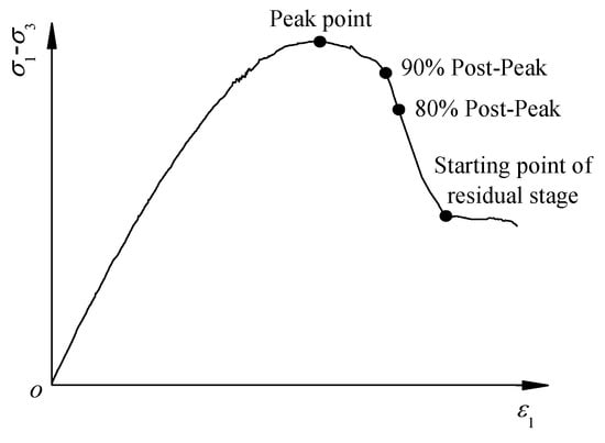Fractured sandstone specimens with different degrees of damage were prepared using pre-peak and post-peak unloading tests on intact sandstone under triaxial compression [14,22]. The preparation of fractured specimens consisted of the following loading and unloading steps. First, the confining pressure was applied to the specimens at a constant rate of 0.05 MPa/s until the design value of 30 MPa was reached, ensuring that the specimen was under uniform hydrostatic stress. Second, the axial stress was applied to the specimen at a constant axial displacement rate of 0.002 mm/s until the desired unloading points under the confining pressure of 30 MPa. Then, the axial stress and confining pressure were alternately unloaded to zero to obtain fractured specimens with different degrees of damage. The desired unloading points were set as the peak point, post-peak 90% and 80% peak strengths, and the starting point of the residual stage (Figure 3). The stress-strain curves during the preparation of fractured specimens are presented in Figure 4, and the mechanical parameters of the specimens at the unloading points are reported in Table 1. In Figure 3 and Figure 4, σ1 and σ3 are the axial stress and confining pressure, ε1 and ε3 are the axial strain and radial strain, respectively.