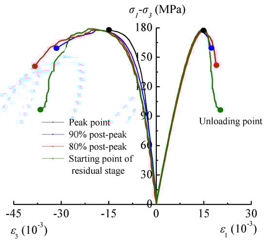 To quantify the damage (D) of fractured specimens, we defined the volumetric dilatation strain ratio between the points in the complete stress-strain curves and the starting points in the residual stage of the specimens under a confining pressure of 30 MPa to calculate D, which can be expressed by the following equation [28,29]: