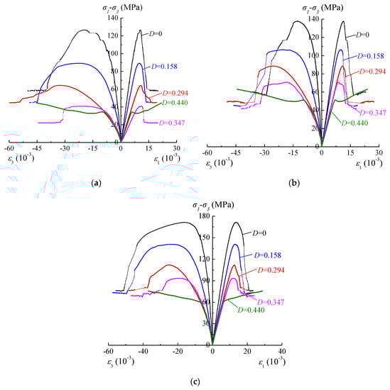 Stress-strain curves of fractured specimens with different degrees of damage. (a) σ3 = 5 MPa; (b) σ3 = 10 MPa; (c) σ3 = 20 MPa.