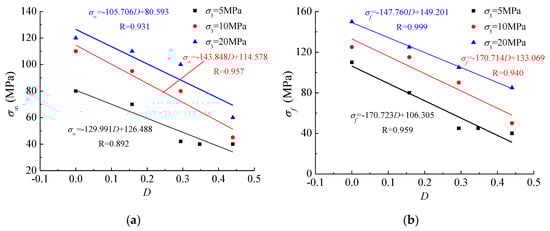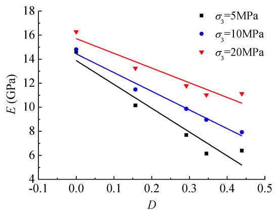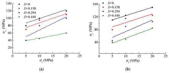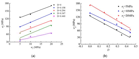 From Figure 5 and the data listed in Table 2, it can be determined that the confining pressure (σ3) and damage (D) have significant effects on the peak strength (σp) and residual strength (σr) of fractured specimens. Figure 6 further illustrates the effect of confining pressure and damage on the peak strength of fractured specimens. From Figure 6, we can conclude that the peak strength of intact and fractured specimens under triaxial compression increase linearly with increasing confining pressure but decreases linearly with increasing damage [33,34].