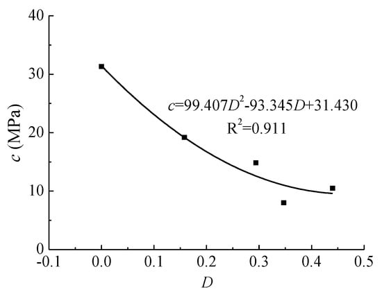Based on the peak strength values listed in Table 2, the equivalent cohesion (c) and internal friction angle (φ) can be calculated using the linear Mohr-Coulomb criterion [8,28], as listed in Table 3. From the data given in Table 3, it can be seen that the equivalent cohesion of fractured specimens decreases with increasing damage, as shown in Figure 7. The damage has little effect on the equivalent internal friction angle of fractured specimens at D < 0.440, and the range of the equivalent internal friction angle is only 0.60%−7.25%. When the damage reaches to 0.440, the irregular fractures of fractured specimens were gradually filled with small rocks and grains, and the sensitivity of the peak strength to confining pressure dropped quickly, resulting in a sharp drop of the equivalent internal friction angle, as listed in Table 3.