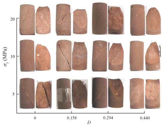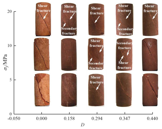 Figure 8 illustrates the failure modes of fractured specimens with different degrees of damage. From Figure 8, it can be seen that the damage significantly influences the failure modes of fractured specimens. For intact specimens, the micro-fractures firstly initiated along the mineral grain boundaries or through the grains, and the tensile stress and shear stress existed at the fracture tip. The tensile stress at the fracture tip was restricted by confining pressure in triaxial compression, so the shear fracture was mainly formed by the shear stress. The intact specimens all experienced typical shear failure modes with a single fracture, which did not depend on the confining pressure. But for fractured specimens, micro-fractures and shear fractures extended with increasing stress, which caused some secondary fractures to initiate and extend near the main shear fractures. With increasing damage, the failure modes of fractured specimens changed from single shear failures to multiple shear failures with two or more fractures. One main shear fracture penetrated fractured specimen to divide the specimen into two blocks, and one or more secondary fractures perpendicular to or oblique to the main fracture were also observed, resulting in multiple shear failures of fractured specimens.