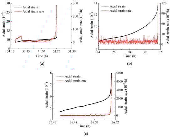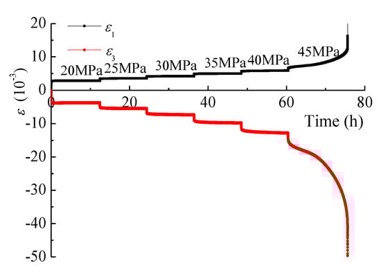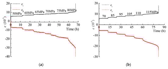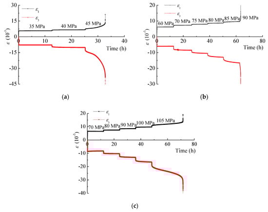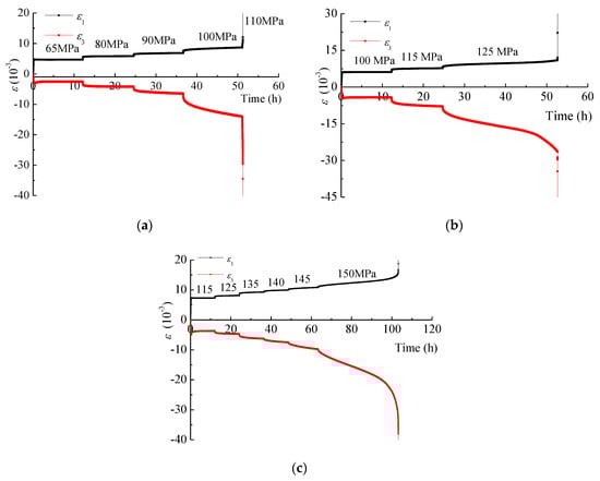When the differential stress was increased to the final stress level, the creep deformation of the specimens was mainly accelerated creep or steady creep followed by accelerated creep, and all of the specimens experienced creep failure, as shown in Figure 17.