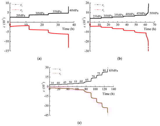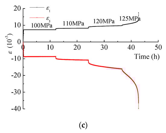 Typical triaxial creep test curves of intact specimens. (a) σ3 = 5 MPa; (b) σ3 = 10 MPa; (c) σ3 = 20 MPa.