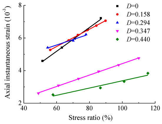 From Figure 15, we can conclude that the axial instantaneous strain increases linearly with increasing stress ratio, mainly caused by the closure of initial fractures at low differential stress and the initiation and extension of secondary fractures at high differential stress. However, with increasing damage, the irregular fractures of fractured specimens were gradually filled with small rocks and grains, maintaining the good structural and bearing capacity of fractured specimens, which led to the linear decrease of the sensitivity coefficient of the axial instantaneous strain to the stress ratio.