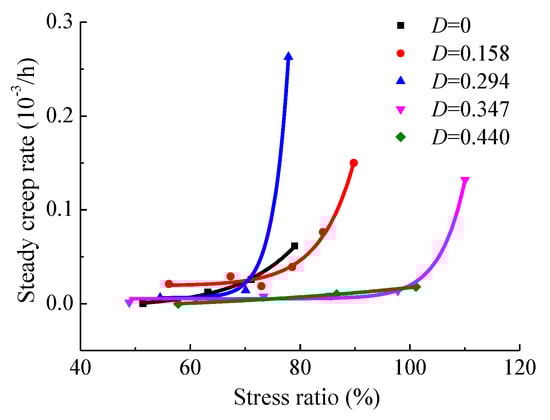 By calculating the slope of the strain curves shown in Figure 10, Figure 11, Figure 12, Figure 13 and Figure 14, the creep strain rate of specimens with different degrees of damage during the creep deformation process can be obtained [8]. The results show that the creep rate of specimens with different degrees of damage depends on both the differential stress and the damage. For lower differential stress values, the creep deformation of all of the specimens contained two stages: a primary creep stage with a decreasing strain rate, and a steady-rate creep stage with a constant strain rate [37]. In the primary creep stage, the axial creep strain increased with time, but the creep rate decreased rapidly to the steady creep rate. With increasing stress, the steady creep rate increased rapidly (Figure 16). For example, at the differential stress of 80 MPa (63.22% σp), the steady creep rate of specimen R-1 was 1.22 × 10−5/h. When the differential stress was increased to 90 MPa (71.12% σp) and 100 MPa (79.03% σp), the steady creep rate of specimen R-1 was 2.57 × 10−5/h and 6.14 × 10−5/h, respectively, which were significantly higher than the value at the differential stress of 80 MPa.