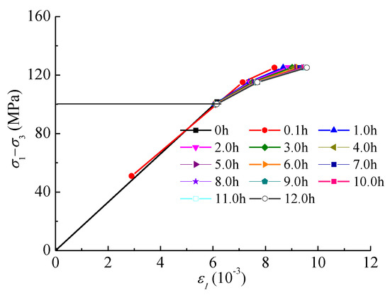 Based on the creep curves for different stress levels, stress-strain isochronal curves were created for fractured specimens (Figure 18). The stress value corresponding to the inflection point of the stress-strain isochronal curve can be defined as the long-term strength of fractured specimens [38,39].