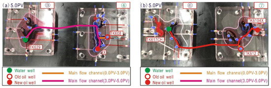 However, it does not mean that all measures on changing locations and amounts of wells must cause the change of the main flow channels, such as in Scheme 4 (Figure 26). After adjustment, the new production well named Z had produced nothing during water flooding in combined Models ③⑦, and the main flow channel was the same as that before 3.0 PV. In combined Models ⑧⑦, the new production well called S74 stopped production after a simulated oil bulk of 6 mL having been driven out. Meanwhile, the main flow pathway recovered like that at 3.0 PV. By contrast, in combined Models ⑧⑩, the old production well TK659 had no production, and the new production well marked as A started to produce continuously, so the new main flow pathway was formed. The effect of water drive also did behave much better, as shown in Table 4. This further implies that the adjusting effect of water flooding was determined by whether new flow channels could be formed.