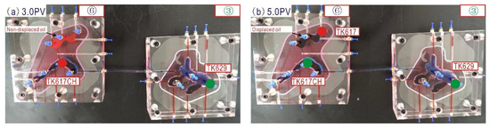 Residual oil distributions of the combined model ⑦③ (a) and ⑦⑧ (b) in Scheme 1 at 3.0 PV.