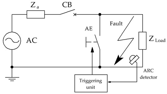 The idea of using the arc eliminator to protect low-voltage network equipment; CB—circuit breaker, ZLoad—load (Ω), AE—arc eliminator, Za—impedance of the power line (Ω).