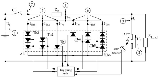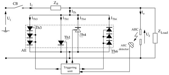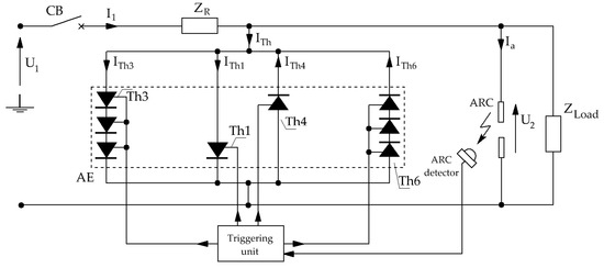 The thyristor arc eliminator is a protective device connected in parallel to the load. A substitute diagram of the low-voltage power grid is shown in Figure 1.