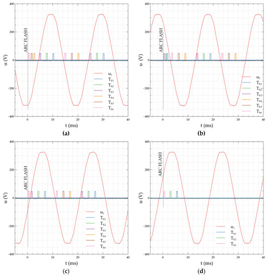 Figure 5 shows the recorded gating pulses of the individual thyristor sections. In each of the four presented oscillograms, supply voltage U1 and gate voltage impulses triggering the thyristors Th1, Th2, Th3, Th4, Th5 and Th6 were recorded. For the positive half-wave, the supply voltages are sequentially Th3, Th2, and Th1, and for the negative half-wave the supply voltages are Th6, Th5, and Th4. Figure 5a shows the arc ignition moment during a negative supply voltage semi-wave and Figure 5b shows the arc ignition moment during a positive supply voltage semi-wave. The test circuit was designed in such a way as to create favorable conditions for subsequent arc ignitions. Detection of the electric arc and identification of the direction of the disturbed current flow causes the generation of the control pulse and the sequential triggering of the appropriate group of thyristors. Successive electric arc flashes trigger the detection system and cause subsequent triggering of the thyristor groups.