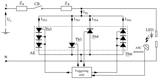 The use of two oppositely connected thyristors as an arc eliminator can be limited by the permissible forward current for each thyristor [26,27]. AE semiconductor elements must be selected in such a way as to allow the flow of the interference current as long as it is required to eliminate the interference or trip the master circuit breaker. It makes it more difficult to choose semiconductor elements and increases of the construction costs of an arc protection device. The current-carrying capacity of an arc eliminator can be increased through parallel connection of semiconductor components. However, this connection arrangement has several disadvantages. It requires careful selection of semiconductors, assurance of simultaneous control of all gates and alignment of current values in thyristor branches.
