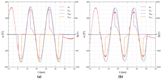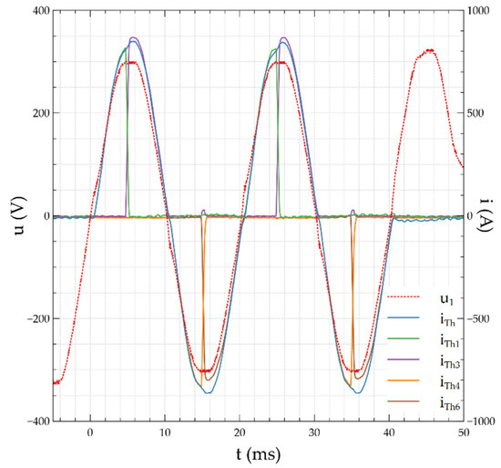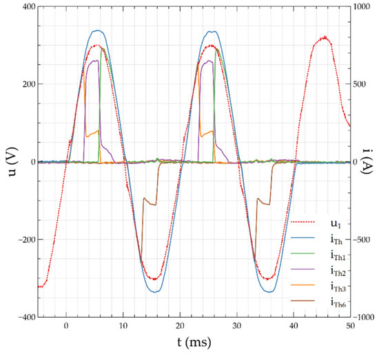Due to the short circuit conditions at the measuring point, the value of the ITh was limited by means of additional impedance ZR to the maximum value IThmax. The circuit has a resistive character, and the insignificant inductance included in the impedance results from the parameters of the power supply circuit and the connections inside the AE. The preliminary test in the systems shown in Figure 6 and Figure 7 was carried out at triggering the Th3 thyristor sections at the moment of passing the voltage half-wave through zero. They were made in a circuit with a simulation of arc by means of an LED diode turned on at the moment u1(t) = 0 V. This method of control allows to register the possibility of dividing the full half-wave of the flowing current into fragments and show conduction through individual thyristor sections.