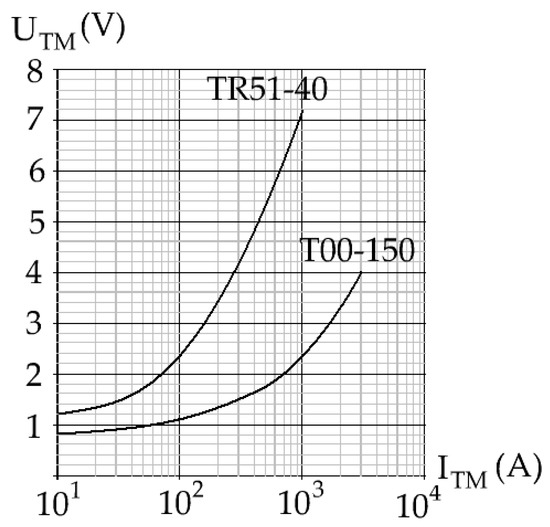 Figure 11 shows a two-sectional arc eliminator in which sections Th2, Th1 and Th5 were built using TR51-40 thyristors, while section Th4 was formed by T00-150 thyristor. The recorded waveforms of currents and voltages in this system for two maximum current values at 850 A and 1650 A are shown in Figure 12. For a positive half-wave, supply voltage may be conducted by the Th2 section, in which thyristors TR51-40 are used. At the moment when the current reaches a maximum of 850 A (ITh2 = 600 A effective current value), the Th1 section is triggered. The voltage on one conductive thyristor TR51-40 read from Figure 10 at current ITM = 850 A is just over 6 V.