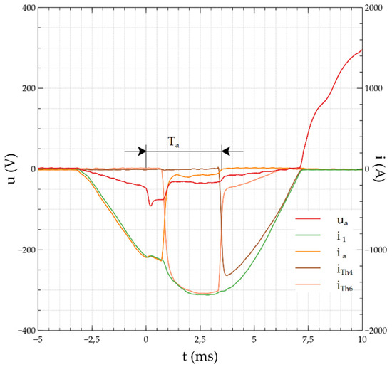 For the system in Figure 3, this is the Th3 branch. Voltage u2 is reduced to 32 V. This is the voltage on three serially connected semiconductor elements of the arc eliminator. The commutation of current by the Th3 thyristor branch does not cause a decrease in arc voltage ua below the minimum arc burning value. A burning electric arc maintains current flow through the affected branch. The value of current ia is 120 A in the initial phase and increases to 200 A with an increasing value of the supply voltage. After the programmed trigger time of the subsequent thyristor sections has elapsed, the lower-third order branch, Th2, consisting of two serially connected thyristors, is switched on. The flow of the iTh2 current through the Th2 branch lowers the arc voltage below the minimum value of the arc burning, which results in its extinguishing and reducing the ia current to zero. In the last step, after the programmed time has elapsed, the branch of the lowest order Th3 built of one thyristor is switched on. Full commutation of the iTh3 current and a low voltage drop on the thyristor in the direction of conduction cause the complete switching off of Th3, Th2 and iTh3, iTh2 branches and the disappearance of iTh3 and iTh2 currents. In this case, the arc was already extinguished during the work of the second section (Th2) of the MSAE.
