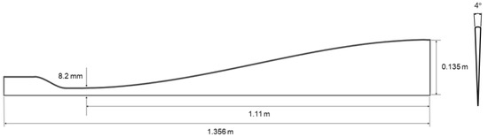 In the present study, the wedge-shaped finite-volume mesh of the nozzle, as depicted in Figure 2, was used to calculate the axisymmetric nozzle flow. The nozzle had a diameter of 16.4 mm at the throat and 0.27 m at the exit. The length of the expansion section was 1.11 m and the wedge angle was 4°. The number of mesh cells was 150 × 60. The nozzle reservoir conditions were obtained from the experiment of Lorrain: a stagnation pressure of 44.2 MPa and a stagnation enthalpy of 3.74 MJ/kg. Additionally, a non-slip wall condition was applied. The numerical simulation was conducted by using the thermochemical nonequilibrium assumption, and the obtained flow properties were pressure of 1877.99 Pa, Mach number of 8.42, translational temperature of 260.68 K, vibrational temperature of 640.32 K, and density of 0.02471 .