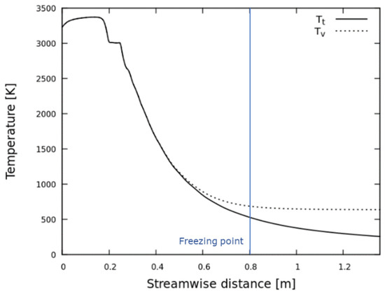 The two-temperature model is the most fundamental model available in modelling thermal nonequilibrium as it assumes a single temperature for the translational-rotational mode and another single temperature for the vibrational electronic excitation for all the molecules [11,12]. As this study focuses on the difference between the thermal equilibrium and thermal nonequilibrium, the primitive two-temperature model is adopted rather than more complicated multitemperature models. The translational and vibrational relaxation rates are given by the Landau–Teller equation with the modified Millikan–White relaxation time model [13]. There are options at different levels of fidelity and complexity in describing the nonequilibrium energies to model hypersonic flows. One of the immediate ways of increasing the complexity of the modelling is to treat the vibrational temperature of , and NO independently. To do so, the vibrational–vibrational energy exchanges among the three molecules need to be incorporated. As the energy transfer rates are not known accurately, this increase in complexity does not necessarily increase the fidelity of the model. Moreover, the vibrational coupling between the three molecules is known to be strong. In the study [14] where three vibrational temperature and electron temperature were calculated independently, the results showed that these four temperatures were nearly identical, which justifies the validity of the two-temperature model. On the other hand, often the associative ionization to produce and subsequent electron-impact ionization might be considered in the modelling. However, the ionization of air species is only activated at the very high temperature corresponding to the post-shock condition of the inflow velocities over 10 km/s. In general, for the range of the temperature below 4000 K of the present study at the velocity of approximately 2.5 km/s, ionization can be safely ignored. Although the two-temperature model has its own limitation [15], the flow regime of the present study falls into the area where the two-temperature model is considered to be acceptable.