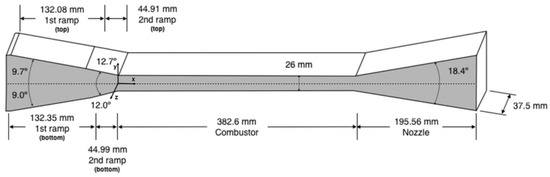 The model scramjet of Lorrain comprises two ramps, a combustor, and a nozzle. The configuration of the model scramjet is asymmetric about the x-z plane and symmetric about the x-y plane, as depicted in Figure 4. The flow turning angles were 9.7° and 3° for the first and second ramps of the top surface, respectively. For the bottom surface, the flow turning angles were 9° and 3° for the first and second ramps, respectively. The length of the combustor was 382.6 mm and the height of the combustor was 26 mm. The width of the model scramjet was 75 mm. The 5 mm of the inflow domain was added in front of the inlet to implement the inflow in the test section effectively. The number of mesh cells was 147,312 for the 2D computational domain and 7,365,600 for the 3D computational domain. For the 3D computational domain, only the half-width of the model was considered, utilizing the symmetric condition at the central plane in the z-direction, to reduce the computational cost. The number of cells used in the present 2D simulation was larger than the baseline cell number used in [8], which was confirmed to be adequate. To ensure the refined mesh near the wall, without adopting any wall function, y+ was selected to be smaller than unity. As a result, the distance from the first grid of each wall was fixed at 5 µm.
