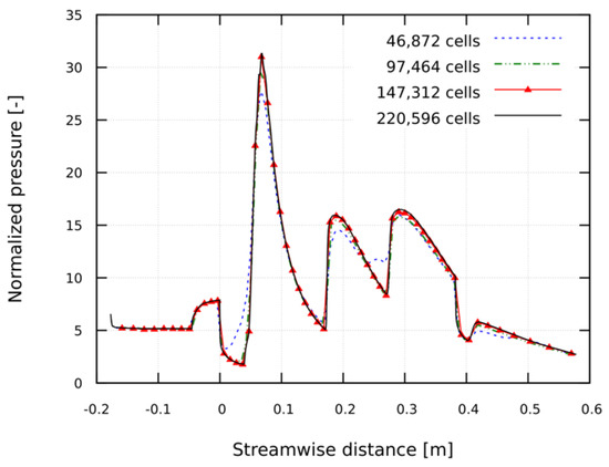 A grid independence test was carried out for the two-dimensional numerical simulations of the flow in the model scramjet, with the thermochemical nonequilibrium inflow conditions, by using four sets of meshes. Figure 5 compares the distributions of the normalized pressure along the bottom wall of the model scramjet by using 46,872; 97,464; 147,312; and 220,596 cells, respectively. The solution using the coarsest grid fails to capture the first reflection of the incident shock wave and the subsequent structure of the shock train. Except for the solution with the coarsest grid, the solutions of the rest of the grids are in good agreement showing convergence along with the increase of grid resolution. The solutions using 147,312 cells and 220,596 cells are practically indistinguishable, which confirms that the numerical solution of the present study with 147,312 cells is grid independent.