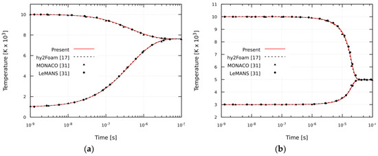 The numerical solutions of the present study for the zero-dimensional adiabatic reactor initially in temperature nonequilibrium undergoing relaxation between temperatures are shown in Figure 6 with the solutions of hy2Foam available from [17], the solutions of LeMANS (The Michigan Aerothermodynamic Navier–Stokes solver) [31], and the solutions of MONACO, a direct simulation of Monte-Carlo code [31]. For both vibrational heating and cooling, the temperature relaxation processes obtained by the present simulations are in good agreement with the data available from the literature.