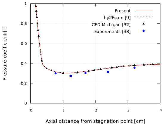 The present solution of a two-dimensional axisymmetric numerical simulation for the Mach 11.3 hypersonic flow over a blunted cone is shown in Figure 7 using the pressure coefficient along the axial distance from the stagnation point, together with other numerical solutions [9,32] and experimental data [33]. The numerical solutions are consistent with each other, whereas all the numerical solutions show minor deviations from the experimental data.