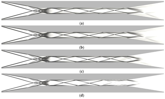 Figure 8 depicts the numerical schlieren images extracted from the results of the four numerical simulations, where the directions of the flows are from left to right. The oblique shocks formed from the first and second ramps of the intake interact with the expansion wave, thereby producing a single shock train. Due to the shock reflections on the combustor wall, three pressure peaks are observed in the combustor section. The interaction of the incident shock into the combustor section and the boundary surfaces of the combustor section forms a separation bubble at the intersecting region due to a strong adverse pressure gradient (see Figure 9b for details). As the geometry of the model is slightly asymmetric between the upper surface and lower surface of the intake (see Figure 4), the shock interactions and reflections in the combustor section and its downstream remain in slight asymmetry. Consequently, while the first crossing point of the reflected shock waves from the upper and lower combustor walls is near the vertical center of the combustor, the second and third crossing points are closer to the lower combustor wall and upper combustor wall, respectively. It can be seen that the shock train structure is well resolved without excessive numerical dissipation in the present simulations.