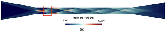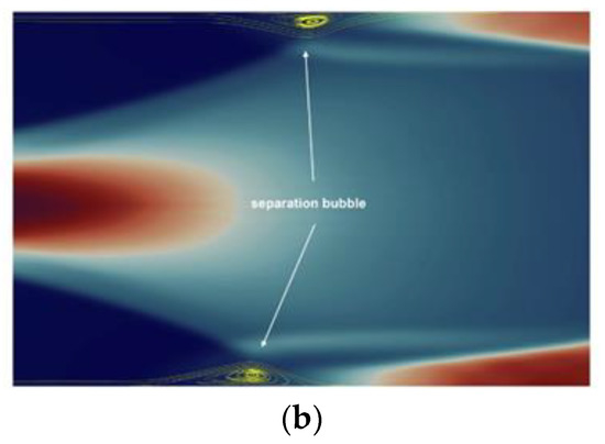 Figure 9 depicts the distributions of the pressure of the 3D-nonequilibrium case for the x-y plane along z = 0. As depicted in Figure 9b, the flow separation regions appear at the first reflected shock wave on both the combustor walls of the model scramjet. This is attributed to the strong adverse gradient of pressure along these surfaces during the shock-boundary layer interaction.