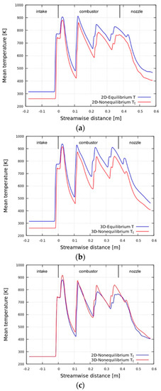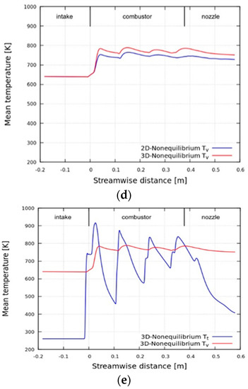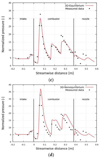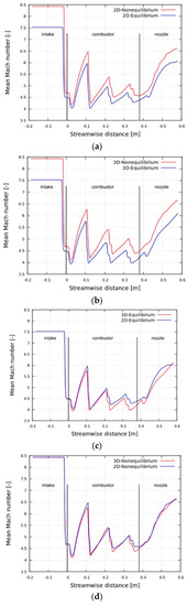 Figure 11 illustrates the differences in the values of Mach number along the centerline between the 2D and 3D cases, and between the equilibrium and nonequilibrium cases. Figure 11a,b shows that the nonequilibrium cases exhibit higher values of Mach number than the equilibrium cases throughout the model scramjet; however, regarding the shock wave positions, the nonequilibrium cases are shifted backward in comparison with the equilibrium cases. These tendencies are consistent with the relations between normalized pressure and the four simulation cases, as depicted in Figure 10. It can be interpreted that higher the Mach number, the smaller the angle of the oblique shock wave, and the smaller angled oblique shock wave causes the reflected shock waves to be shifted backward in position. From Figure 11c,d, the 2D cases exhibit slightly higher values of Mach number than the 3D cases at the first reflected shock; however, in general, there is little difference between them.