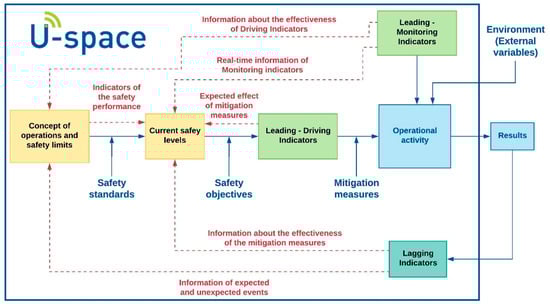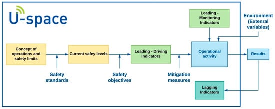 In this work, the authors propose a safety framework for U-space built on safety indicators. This framework is based on the safety culture model of [30,31]. Figure 2 synthesises the U-space operational concept and operational limits determined by interpretations of current safety levels. The operational concept ascertains the safety goals that must be achieved for a specific safety level.