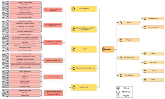 Each of the hazardous and risky situations considered above may be accompanied by various and (more or less) severe consequences. The most severe consequence we have identified is a collision of the unmanned aircraft with another element in one of the following manners:
