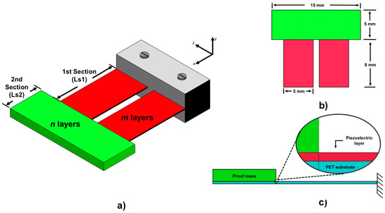 Next, the Rayleigh–Ritz method was adapted to obtain the first bending resonant frequency of the PEH devices with a T-shaped structure. For this, we considered a multilayer model with a variable cross-section in the yz plane (see Figure 2) with homogenous and isotropic materials. The geometries of the PEH devices are symmetric with the plane xy. The two electrodes of the PEH devices are negligible due to their thin thickness (100 nm) in comparison with the substrate PET and piezoelectric layer. In addition, the residual stress of the layers is negligible. Thus, the maximum potential, Pmax-multilayer, and kinetic, Kmax-multilayer, energies (two sections (S1 and S2), two layers for the first section (m = 2) and three layers for the second section (n = 3)) are determined by: