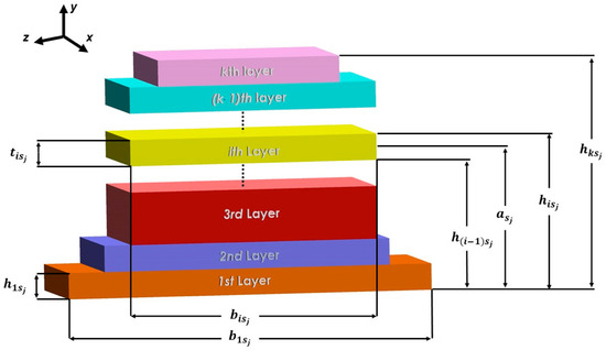 where tisj = hisj − h(i−1)sj is the i-th layer thickness in the j-th section, sj is the j-th section, k is the number of layers on the two different sections (k = m,n,…), Asj is the area on the j-th section, Eisj is the Young’s modulus of the i-th layer on the j-th section, ysj is the height of the j-th section, h(i−1)sj is the distance from the inferior plane of the first layer to the superior plane of the (i−1)th layer on the j-th section, bisj is the total width of the i-th layer ( bis1 includes the sum of width for each one of the two layers of same material at the same distance), and h0sj = 0.