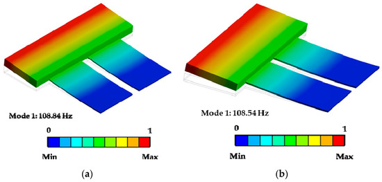 The operation resonant frequencies of the proposed PEH devices could be altered by changing the thickness of their seismic masses. The PEH devices must be designed to have maximum stresses less than the rupture stresses of their materials. In the FEM models, the thickness of the seismic mass was modified to obtain its effect on the first bending resonant frequency of both PEH devices, as shown in Figure 10a,b. Thus, the thickness of the seismic mass of both PEH devices could be adjusted to change their potential application.