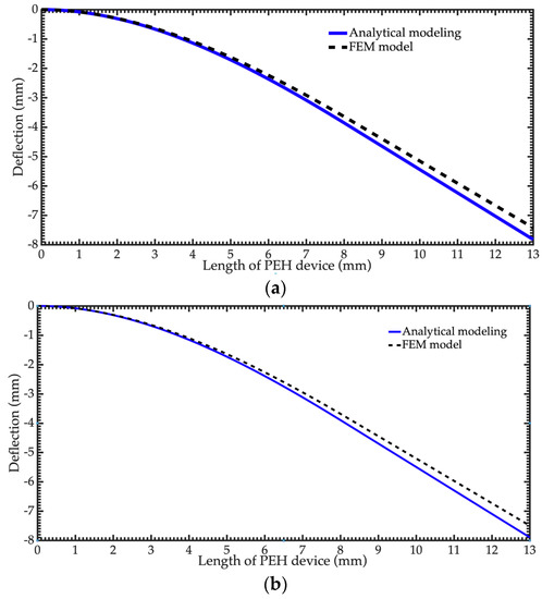 Figure 7a and b show the deflections at resonance of both PEH devices with ZnO and PZT-5A layers, which were obtained using the analytical and FEM models. The deflections calculated with the analytical modeling agree well with those of the FEM models. For the PEH devices with ZnO and PZT-5A layers, the relative errors of the analytical modeling are 5.38% and 5.33% in comparison with the FEM models. By using the analytical modeling, the maximum deflections of the ZnO and PZT-5A-based PEH devices achieve values up of 7.43 and 7.68 mm, respectively. On the other hand, the maximum deflections of both devices through FEM models are 7.83 and 8.09 mm, respectively.
