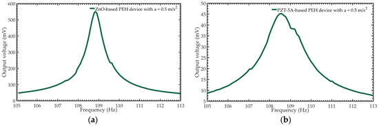 The ZnO and PZT-5A-based PEH devices can generate maximum output voltages of 545.32 and 45.10 mV, respectively. Figure 8 shows the generated voltages as a function of the frequency.