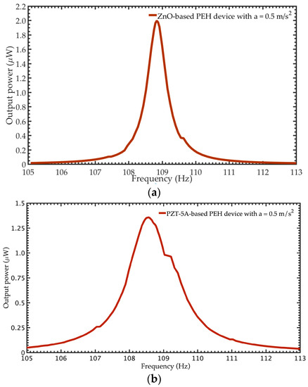 Generated power with respect to the frequency of the PEH devices with ZnO (a) and PZT-5A (b) layers.