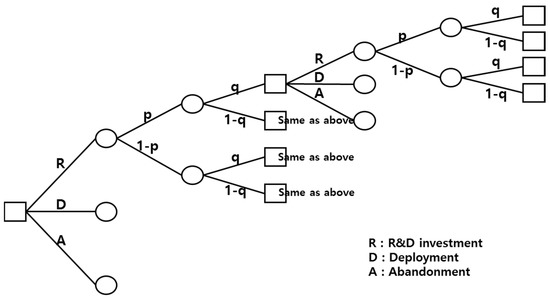 The real option model of this paper addresses the decision problem in which a decision maker (The decision-maker and R&D investor of this paper can be regarded as the Korean government. In Korea, since the electricity companies which own powerplant are government-owned corporations, the objectives of the government and the electricity companies coincide and this paper assumes that the objective function of R&D investment is to maximize the future profits of electricity company) should choose one of three alternatives among abandonment of the project, deployment, and R&D investment in each situation and it can be illustrated using decision tree as shown by Figure 3.