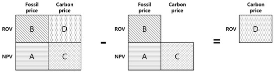 Therefore, the part that the present study aims to quantify in monetary value corresponds to ‘D’ in Figure 4, which can be derived by comparing the results of economic values with and without consideration of the volatility of carbon emission rights prices in our real option model. That is, the economic values which consider the volatilities of both fossil energy costs and carbon emission rights prices simultaneously would correspond to ‘A+B+C+D’. On the other hand, the economic values in which the volatility of carbon emission rights prices were set to 0 correspond to ‘A+B+C’ because the option value due to the uncertainty of carbon emission rights prices did not occur. Therefore, the option value resulting from the uncertainty of carbon emission rights prices could be obtained by deducting the latter value from the former economic value.