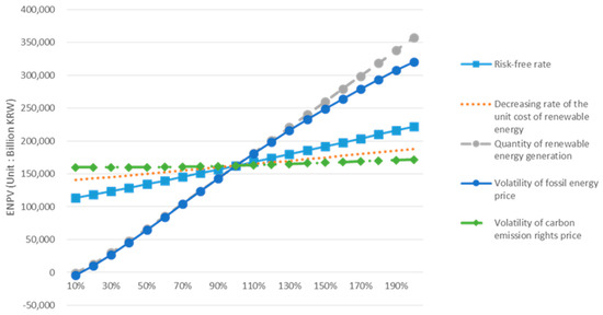 According to the results of sensitivity analyses, it is found that there exists a positive relationship between the economic value of renewable energy R&D and each of the affecting variables. Among them, the most sensitively affecting variable on the economic value of renewable energy R&D was proven to be the quantity of renewable energy generation, followed by fossil energy price volatility, the risk-free rate, the decreasing rate of renewable energy power generation costs, and carbon emission rights price volatility. The reason that the most influential factor is the renewable energy generation quantity could be explained such that revenues after deployment directly depend on the amount of renewable energy power generation as well as there could be large differences in the whole available quantities of renewable energy power generation by the last year according to the timing points of deployment.