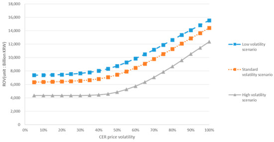 We attempted one more sensitivity analysis to examine the effect of the uncertainty of carbon emission rights prices on the option values of renewable energy R&D. The graphs of Figure 8 showed that ROV increases as the volatility of carbon emission rights prices increases. In addition, when the volatility of fossil energy prices is lower, the economic effect of the option value resulting from the uncertainty of carbon emission rights prices becomes larger. Through this result, it can be inferred that when the uncertainty of fossil energy prices is lower, there could be more incentives for the aggressive investments in the renewable energy to reduce carbon emission to cope with the uncertainty of carbon emission rights prices because the economic values of the flexibility of decision-making become higher.
