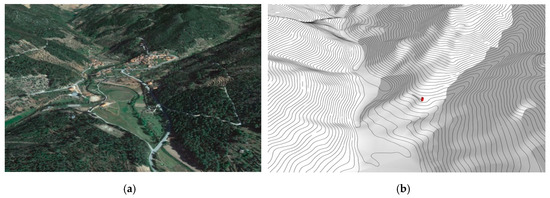 Granja do Tedo’s context. (a) Aerial view with terrain relief (Google Earth); (b) Tridimensional model of the terrain showing the solar exposure at 9:30 a.m. on the winter solstice (case study location marked in red).