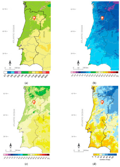 (a) Köppen-Geiger Climate Classification for Portugal; (b,c) Average mean temperature in winter and summer; (d) Average number of days with minimum temperature ≤0 °C in winter (adapted from [39]).
