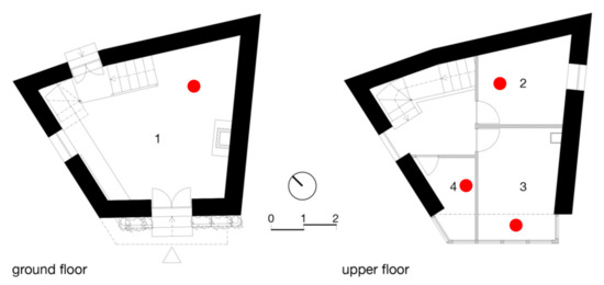 Floor plans showing the location of measuring instruments (1—living room/kitchen; 2—bedroom; 3—bedroom with balcony; 4—bathroom).