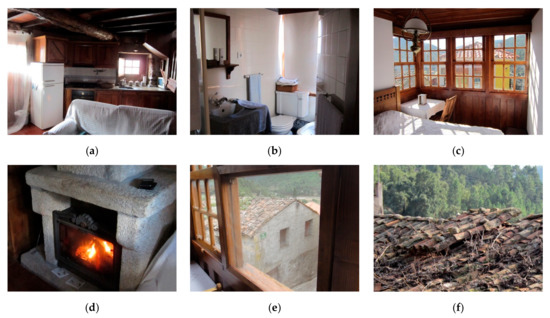 The building envelope consists of granite walls (50–55 cm thick) with a pitched roof, wooden doors, and wooden framed single glazed windows. Indoors, the partitions walls in tabique (earth-filled timber frame walls) were replaced by plasterboard walls. The ground floor is now paved with ceramic tiles, and the upper floor has a wooden floor with timber structure. Table 2 lists the thermal transmittance coefficient (U-value) of the building envelope. The building has no cooling system, and the heating system is a closed wood-burning fireplace (Figure 9d).