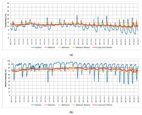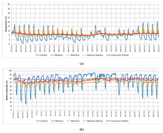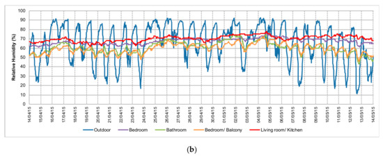Concerning the outdoor relative humidity, it was found that there was a high daily variation, reaching values of around 90% during the night and lower figures of 32.3% during the day (Table 4). The average outdoor relative humidity value was also high, being 84.1% during the monitoring period (Table 4). In contrast, almost all indoor rooms had stable relative humidity profiles with small daily variations. The exception was the bedroom/balcony, where the fluctuations were slightly higher than the other rooms, due to higher solar radiation, but much lower than the variations outdoors. The indoor relative humidity values were high (about 70–80%), higher than those recorded outdoors during the day, but smaller than those verified outdoors during the night. The reduced ventilation rate of the rooms, due to the lack of occupancy, might be the main reason for the high indoor relative humidity levels. During the occupancy period (from 7 to 8 December, 2014) there was a slight decrease in the relative humidity level in the living room and bedroom (Figure 11b) due to the use of the heating systems. However, due to the low outdoor temperatures, the ventilation was minimized to reduce heat losses.