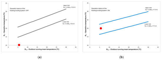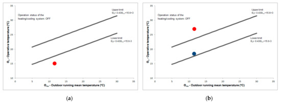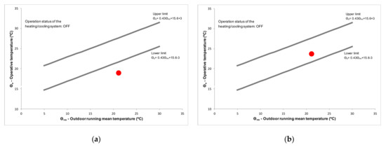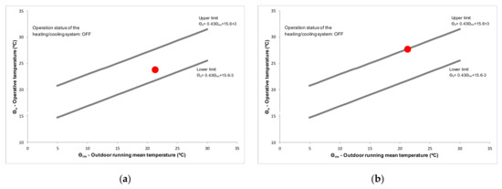Adaptive comfort chart during a representative autumn day: (a) Thermal comfort temperature (operative temperature) in the living room/kitchen; (b) Thermal comfort temperature (operative temperature) in the bedroom/balcony for open curtains (red dot) and closed curtains (blue dot).