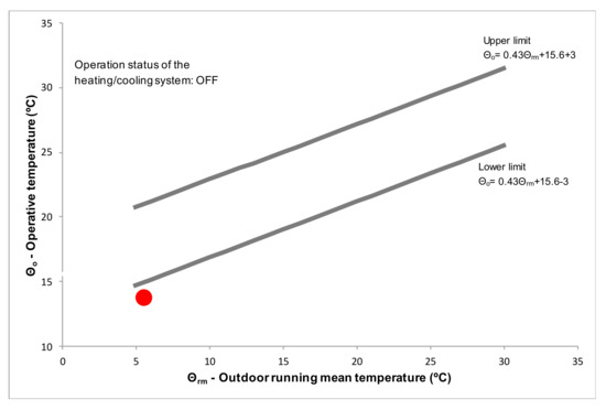 An adaptive model of thermal comfort was used in the analysis of thermal comfort conditions since this is the adequate model for naturally conditioned buildings. The chosen model was the Portuguese adaptive model of thermal comfort, to be more representative of the Portuguese reality [33]. This model is an adaptation to the Portuguese context of the models specified in standards ASHRAE 55 [32,34] and EN 15251 [35]. It considers the typical climate and ways of living and how buildings are conventionally designed and used. According to this model [33]: (i) occupants may tolerate broader temperature ranges than those indicated for mechanically heated and/or cooled buildings; and ii) the outdoor temperature has a strong influence on occupants’ thermal perception/sensation.